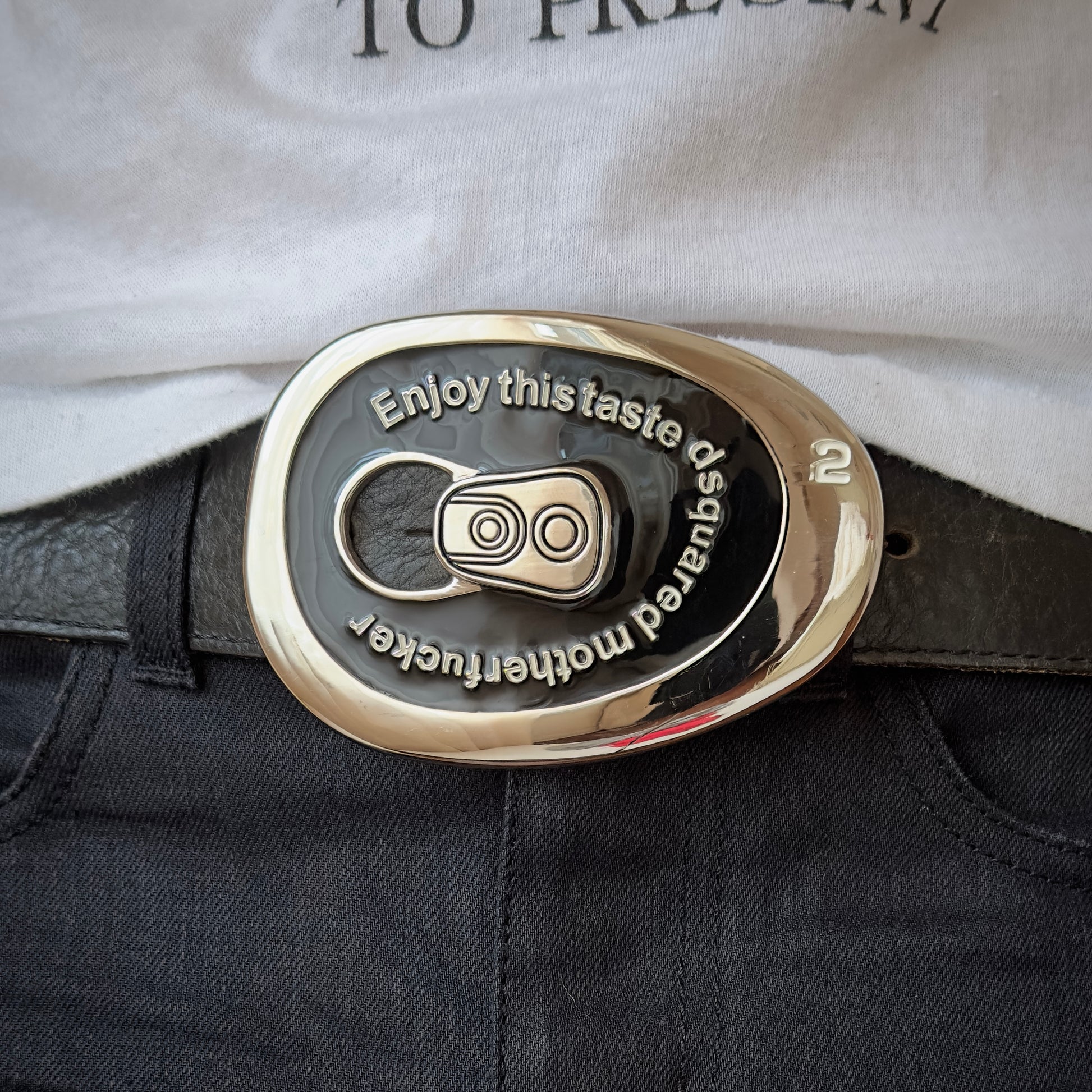 - Features metal crushed can buckle with engraved “Enjoy this taste Dsquared mf-er” slogan